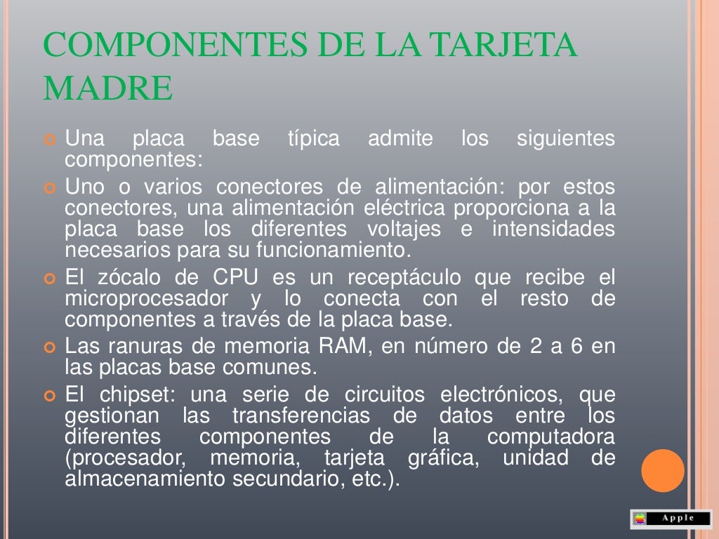 Motherboard significa tarjeta madre y en la práctica se trata de la tarjeta principal de la computadora. Es una serie de placas plásticas fabricadas entre otros materiales, a base de un material llamado "Pertinax", el cuál es insensible al calor y muy resistente. En estas placas se encuentran una gran cantidad de líneas eléctricas (Buses), que interconectan diferentes tipos de conectores soldados a las mismas. A esta placa se conectan todos los demás dispositivos necesarios para el correcto funcionamiento del equipo (tarjetas de expansión,unidades de disco duro, unidades ópticas, suministro eléctrico, el microprocesador, etc.)